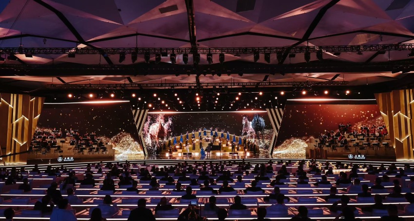 金熊貓盛典的舞美設計以“四川竹林”為核心基調,運用現代材質重新詮釋這一傳統元素。舞美總設計龔睿介紹:“我們從竹林中提煉出豎狀形式感,構成具有包圍感的舞台形式,打造全世界觀眾都能看懂、共情的視覺語言。”