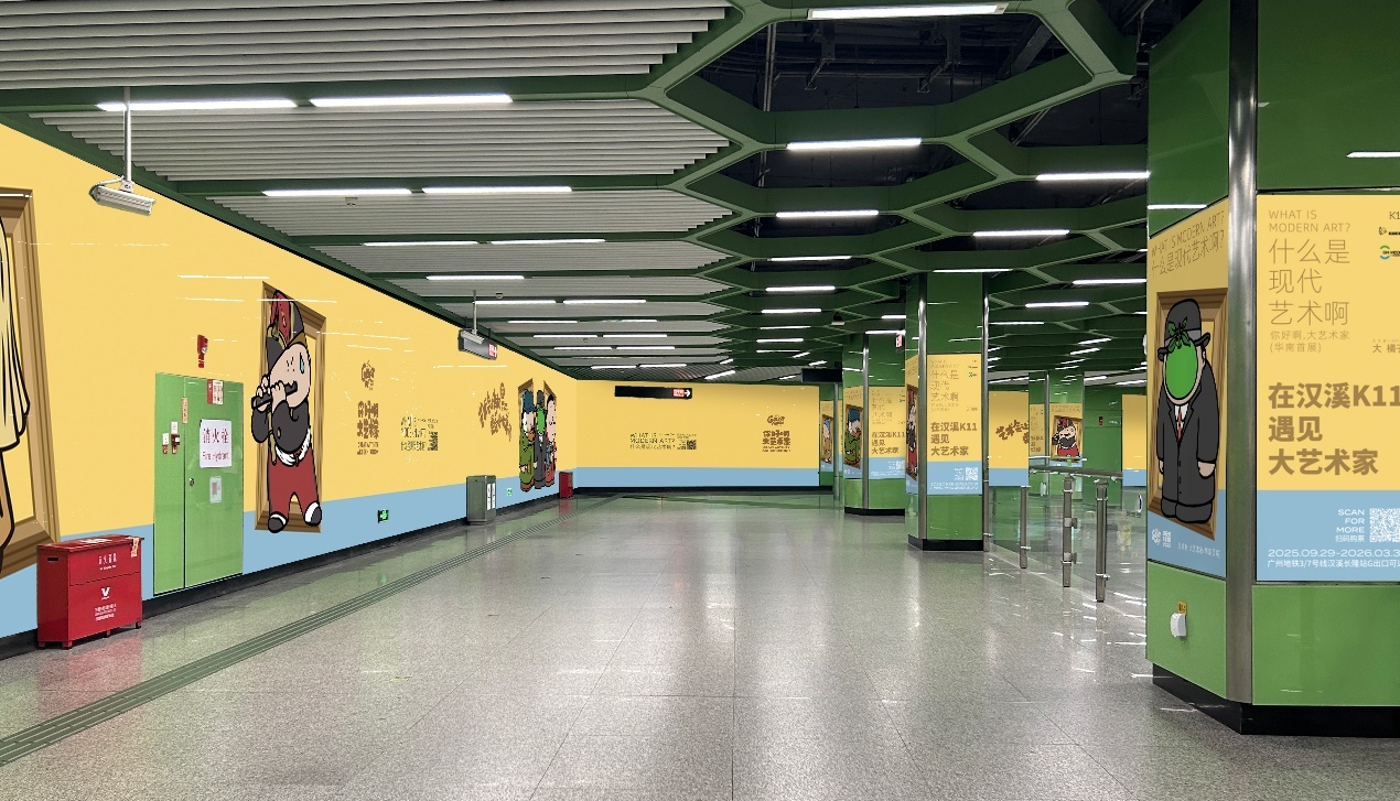 作为新世界中国与广州地铁地产联袂打造的TOD项目,广州汉溪K11将在地铁空间内打造沉浸式“艺术通勤画廊”,让市民得以在通勤途中也能“偶遇”大艺术家。2025年9月22日至2025年10月19日期间,市民可在广州地铁三号线、七号线、汉溪长隆地铁站厅以及全城近20个地铁站点偶遇本次展览的“大艺术家”形象,让繁忙的路途变得有趣起来。