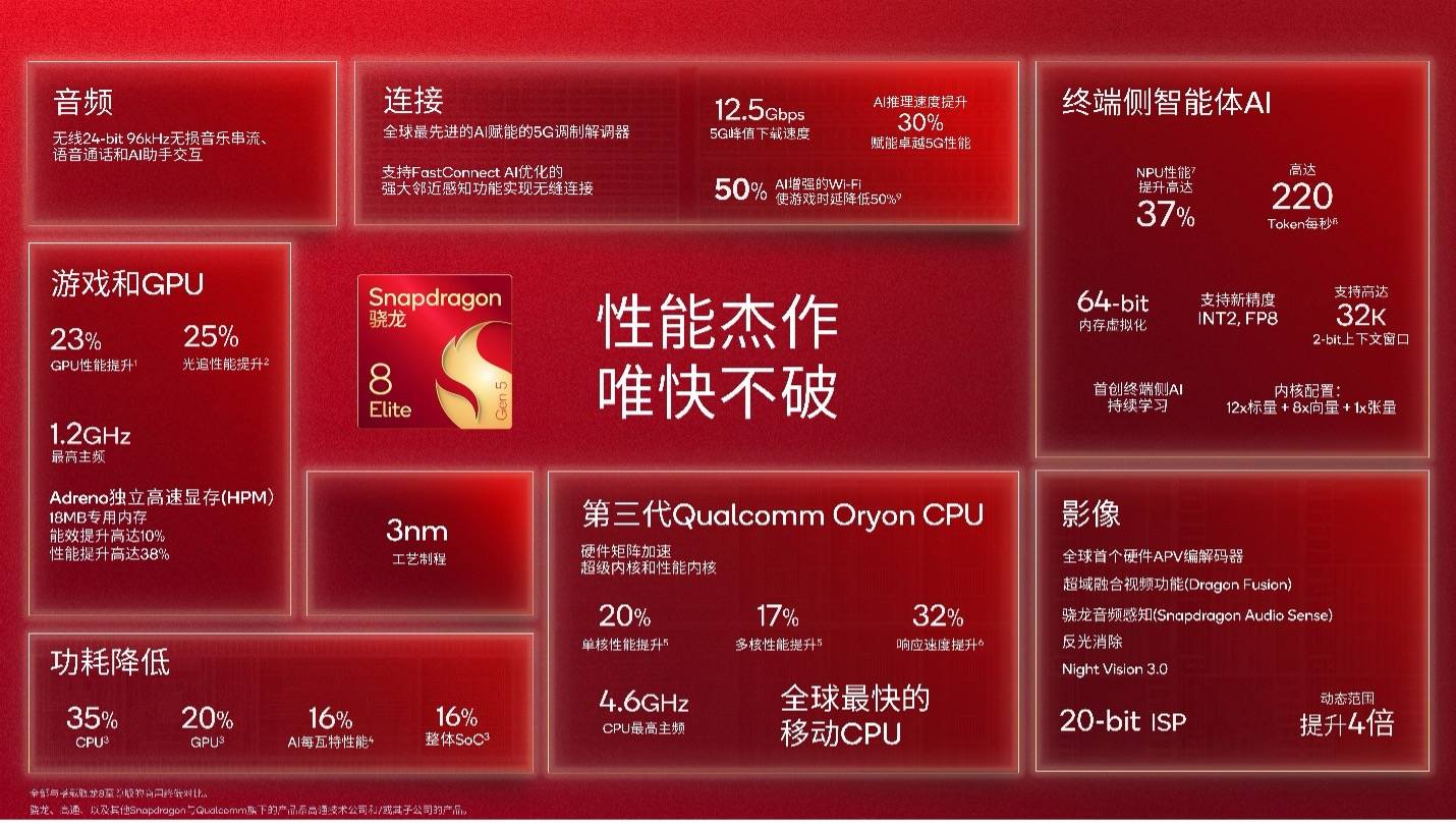 再看手机端的 “速度之王”—— 第五代骁龙 8 至尊版。这款芯片号称 “全球最快的移动 SoC”,从日常用机到专业创作,都能带来大升级。